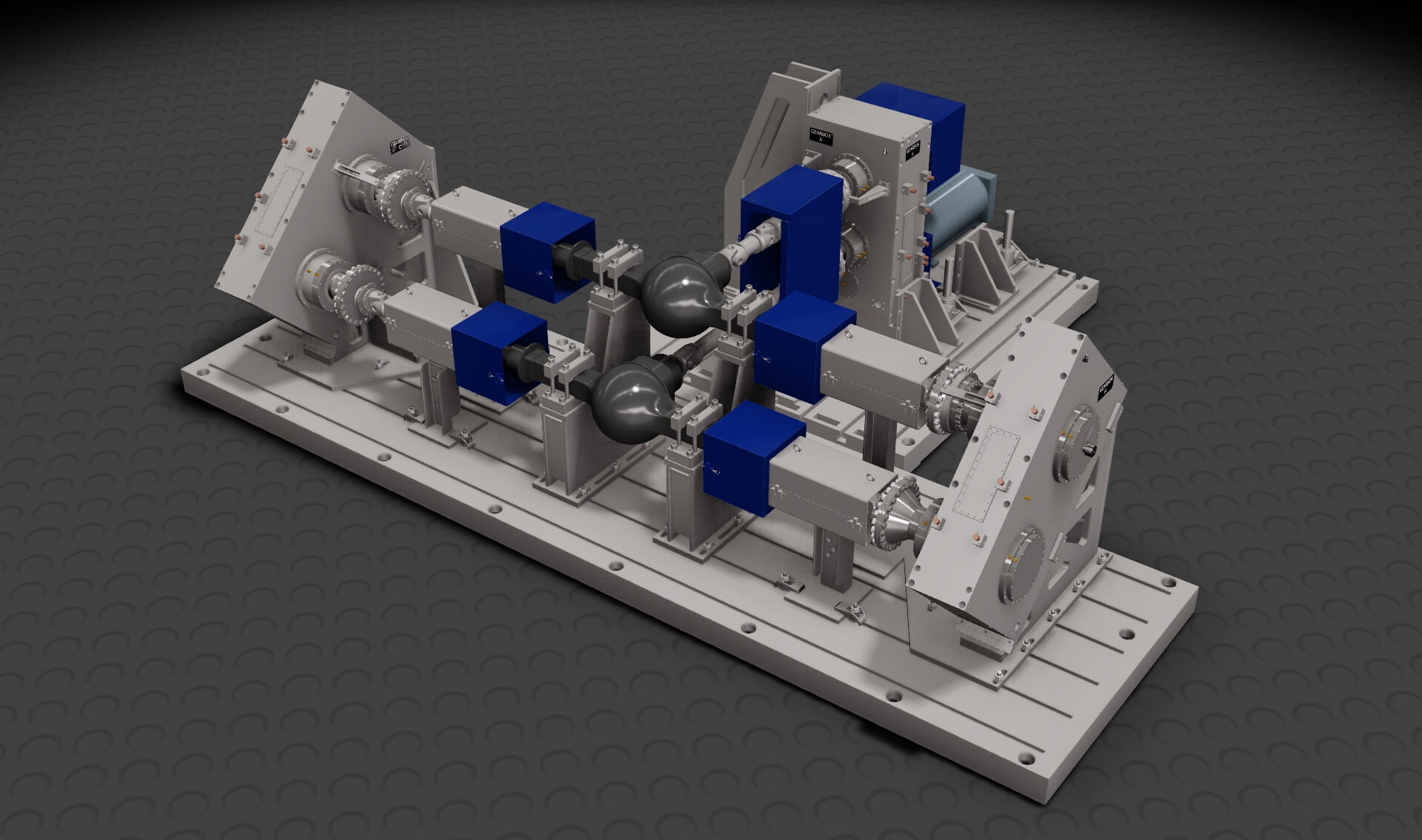 The Model 1850 Six Square Test System evaluates the durability and integrity of axle gear sets. Evaluating gear life and gear design under full torque conditions to optimize axle ratio and axle life. The gearbox layout allows for a reduced horsepower input motor that corresponds to a smaller footprint and less electrical power consumption.